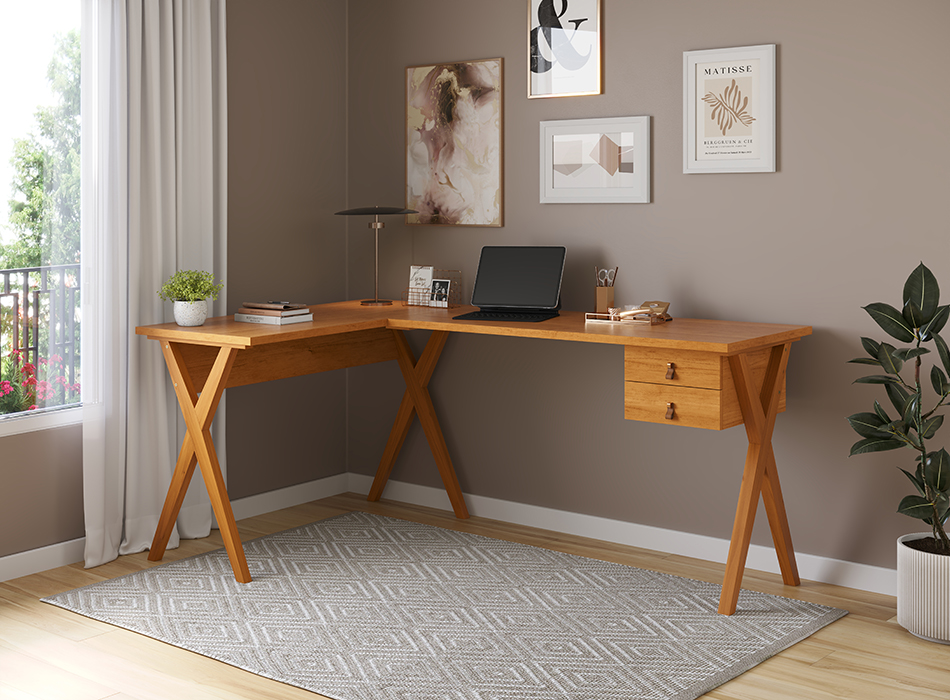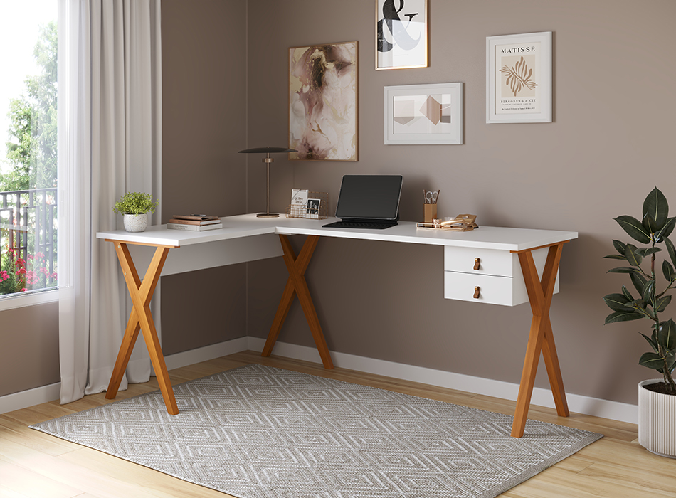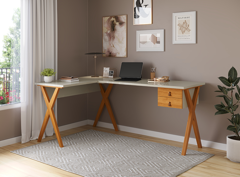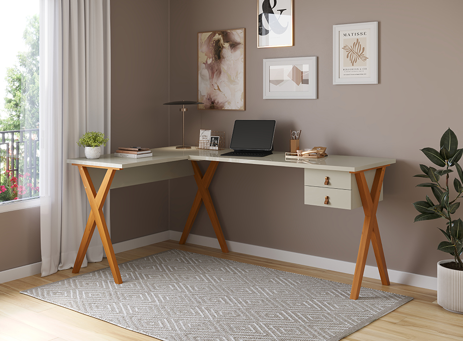 Design inteligente que valoriza cada metro do ambiente. A Escrivaninha de Canto Malta combina tampo de 25 mm com pés em madeira maciça, garantindo resistência, estabilidade e sofisticação. Com 54 cm de profundidade, oferece conforto ideal para a rotina de trabalho ou estudos. Suas duas gavetas com corrediças telescópicas proporcionam abertura suave e total aproveitamento interno, enquanto os puxadores em alça complementam o visual com charme e funcionalidade. Perfeita para otimizar espaços sem abrir mão da elegância.