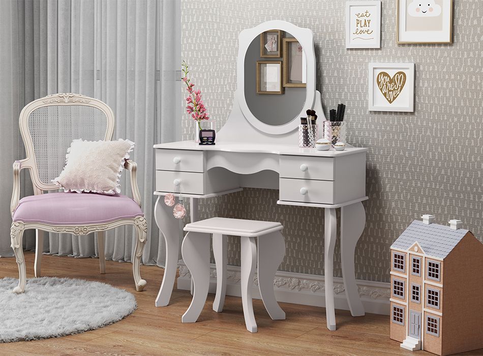 Com seu design delicado e detalhes encantadores, esta penteadeira transforma a rotina de beleza em um momento mágico. Equipado com um espelho lindo e espaço de armazenamento prático, a Penteadeira Princesa oferece o cenário ideal para se prepararem com graça e diversão. Seja para arrumar os cabelos, guardar os acessórios ou simplesmente brincar de se embelezar, esta peça especial torna cada momento único. Adicione um toque de magia ao quarto com esta Penteadeira e crie um espaço digno de contos de fadas