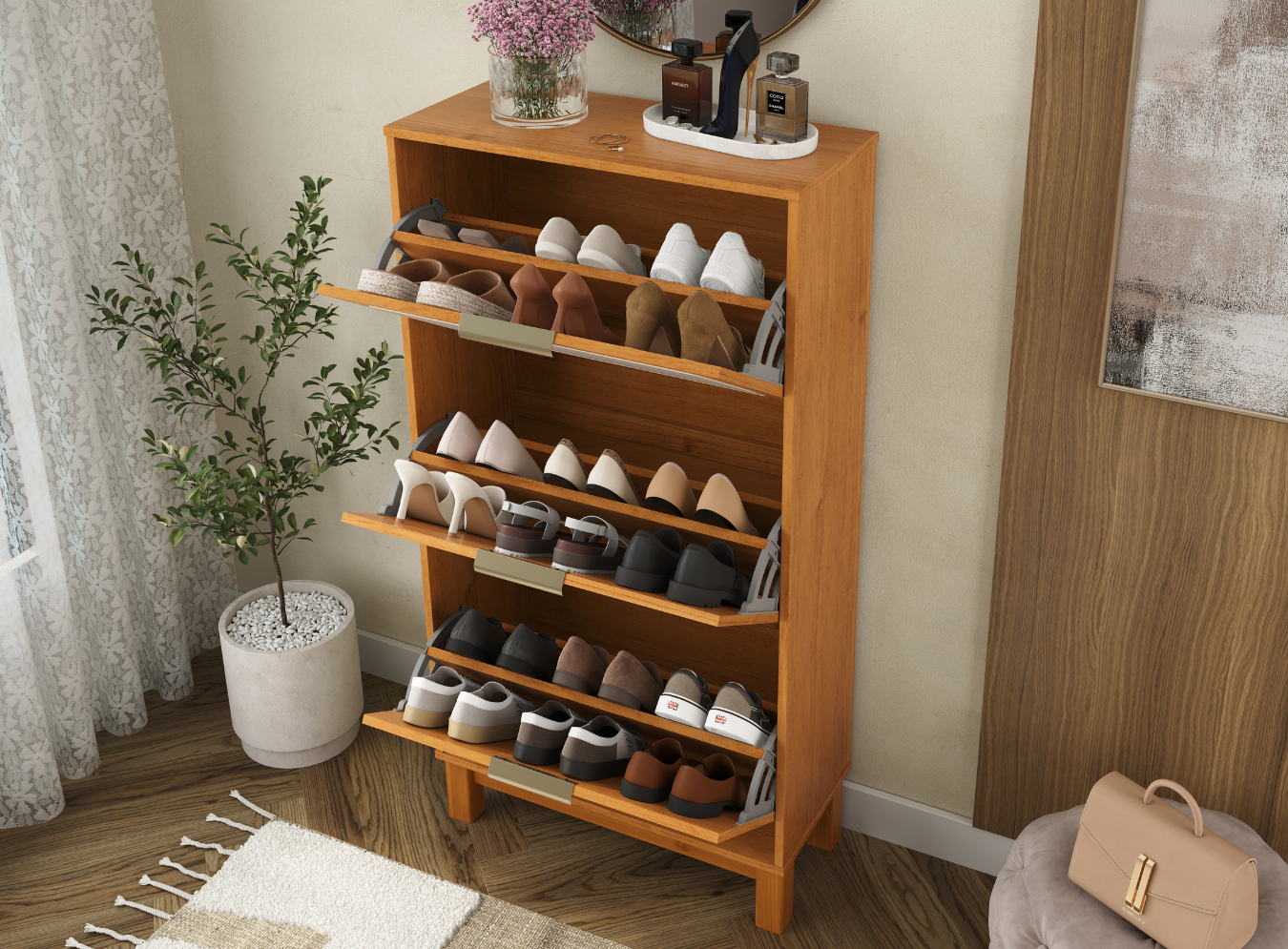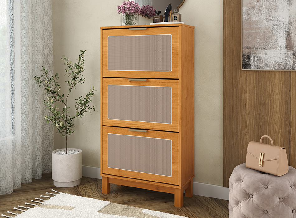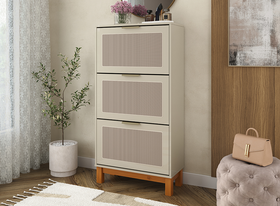 Funcionalidade e elegância em perfeita harmonia. A Sapateira Vivare conta com puxadores de alumínio com pintura epóxi, que garantem resistência e um acabamento refinado. As frentes das portas com aplique em tela sintética agregam leveza e um toque diferenciado ao ambiente. Com três portas com articuladores, oferece praticidade no uso diário e melhor aproveitamento interno. Os pés em madeira maciça completam a peça com estabilidade e sofisticação, tornando-a ideal para compor espaços organizados e acolhedores.